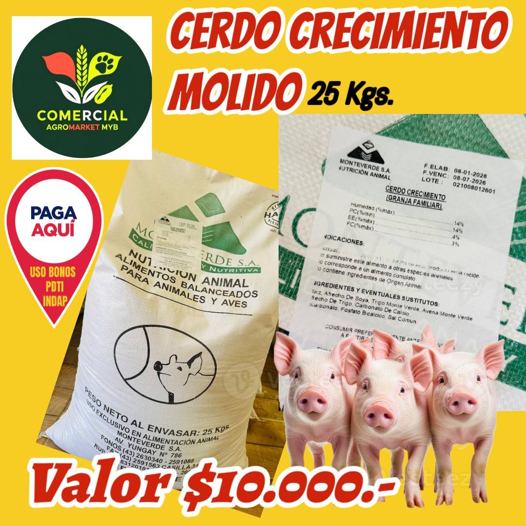 Alimento Pollita Crianza Molida en saco de 25 Kgs. Precio $14.000. Producto de alta calidad para gallinas ponedoras y cerditos.