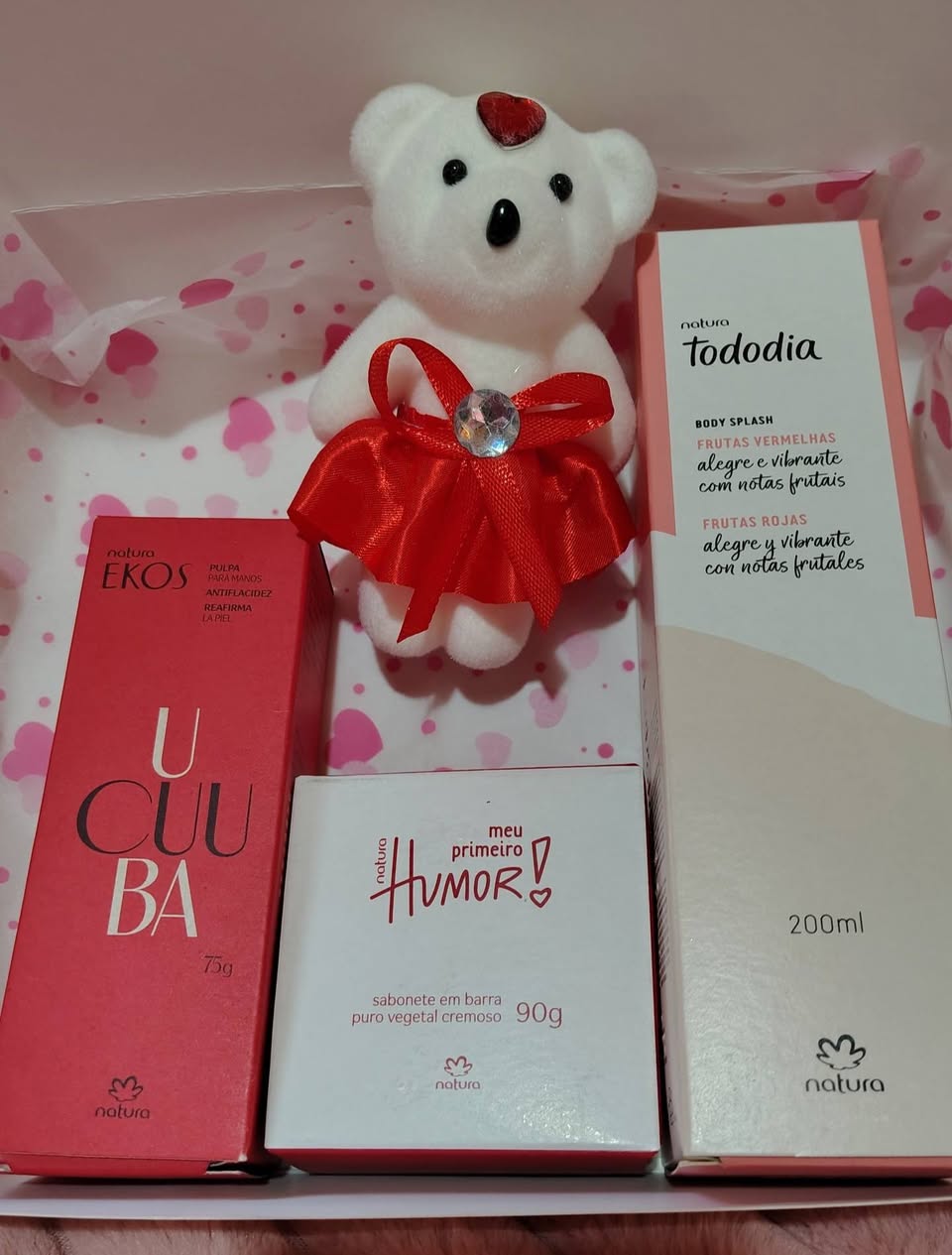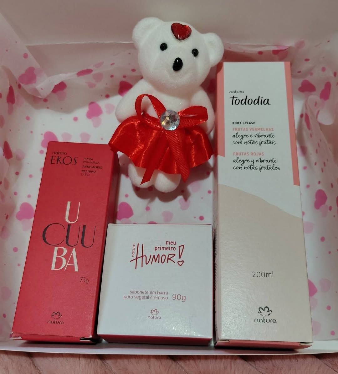 Cajitas surtidas que contienen 1 body splash de frutos rojos, 1 barra de jabón, 1 crema de manos y 1 osito de regalo. Ideal para regalar en el Día de la Madre.