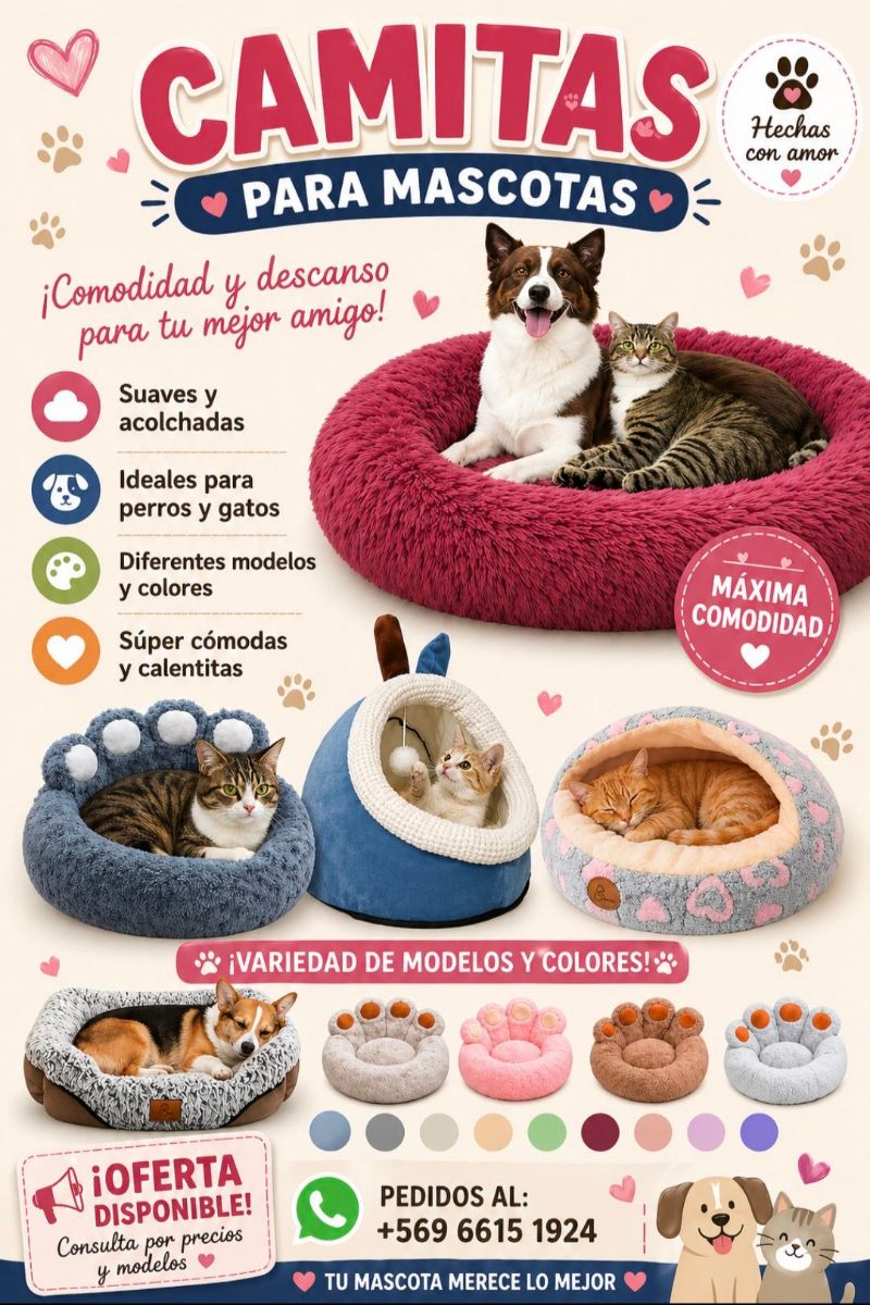 Dale a tu mascota el descanso que se merece con estas camitas súper suaves y calientitas. Ideales para que tus regalones duerman cómodos y protegidos del frío, disponibles en varios modelos y colores según tu gusto.