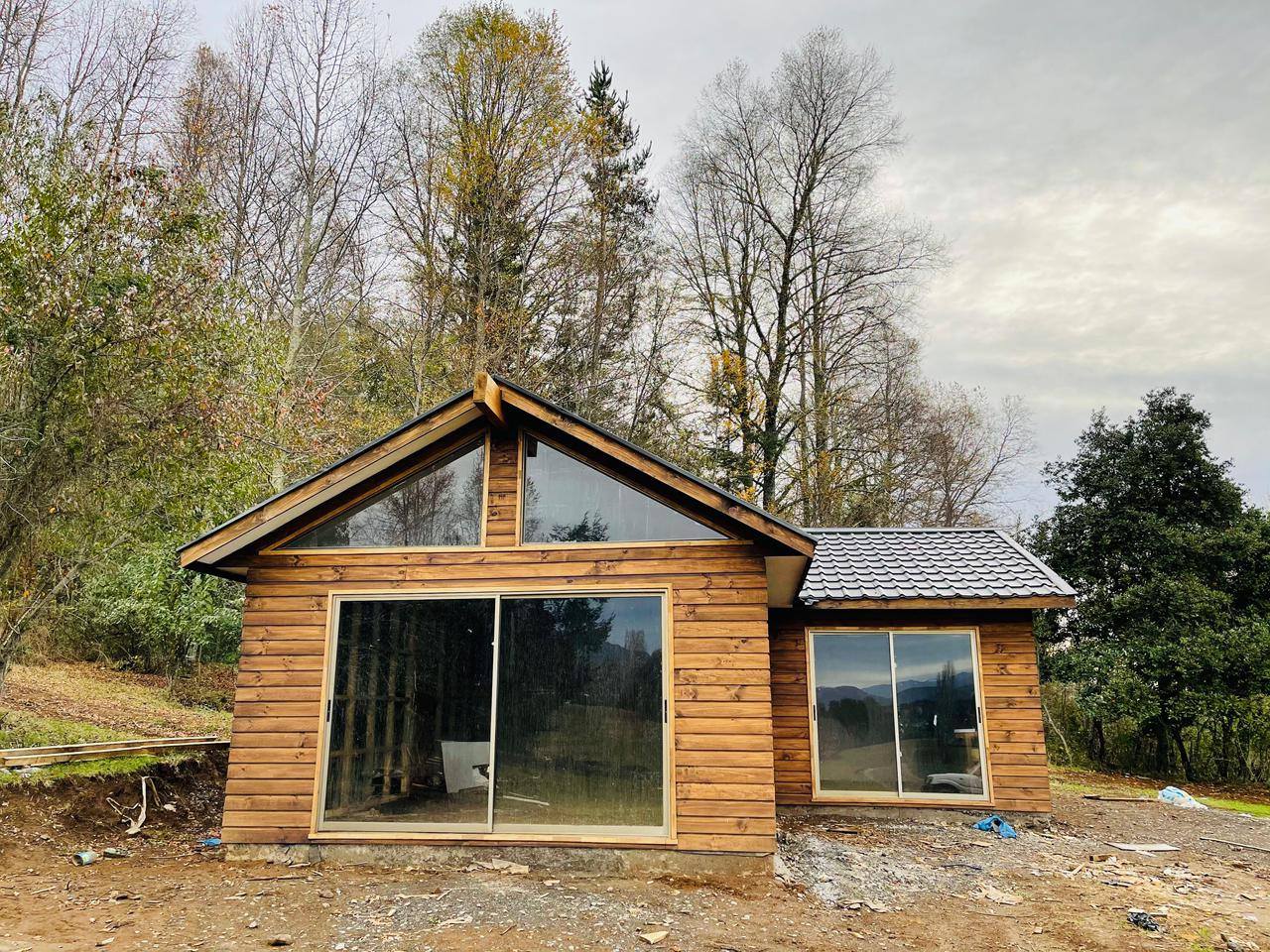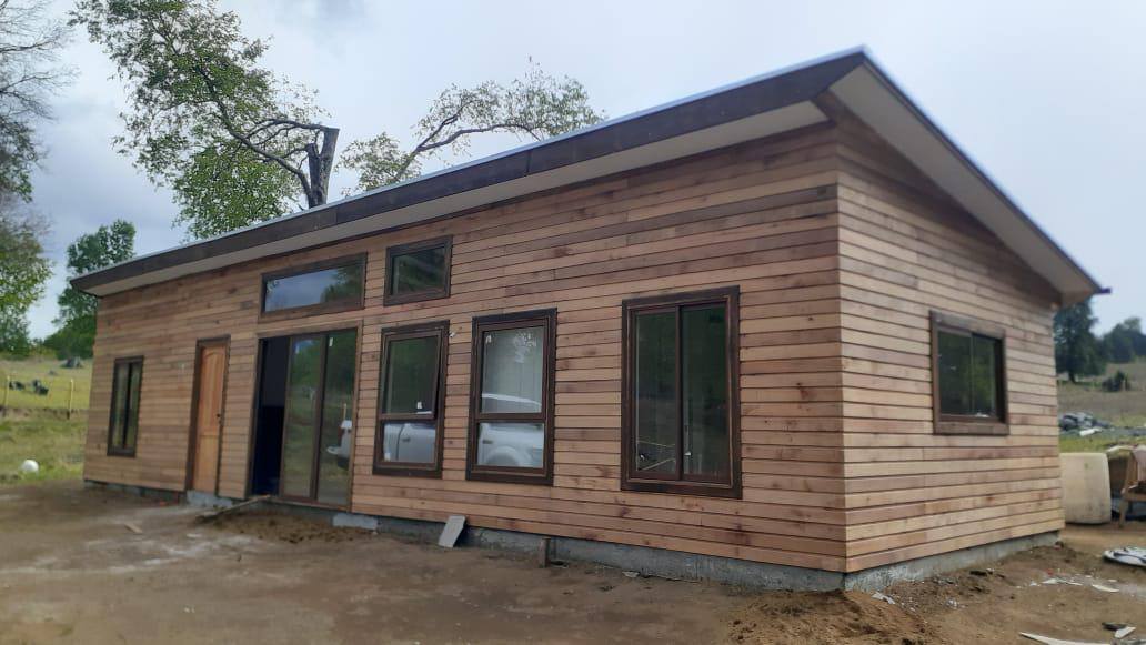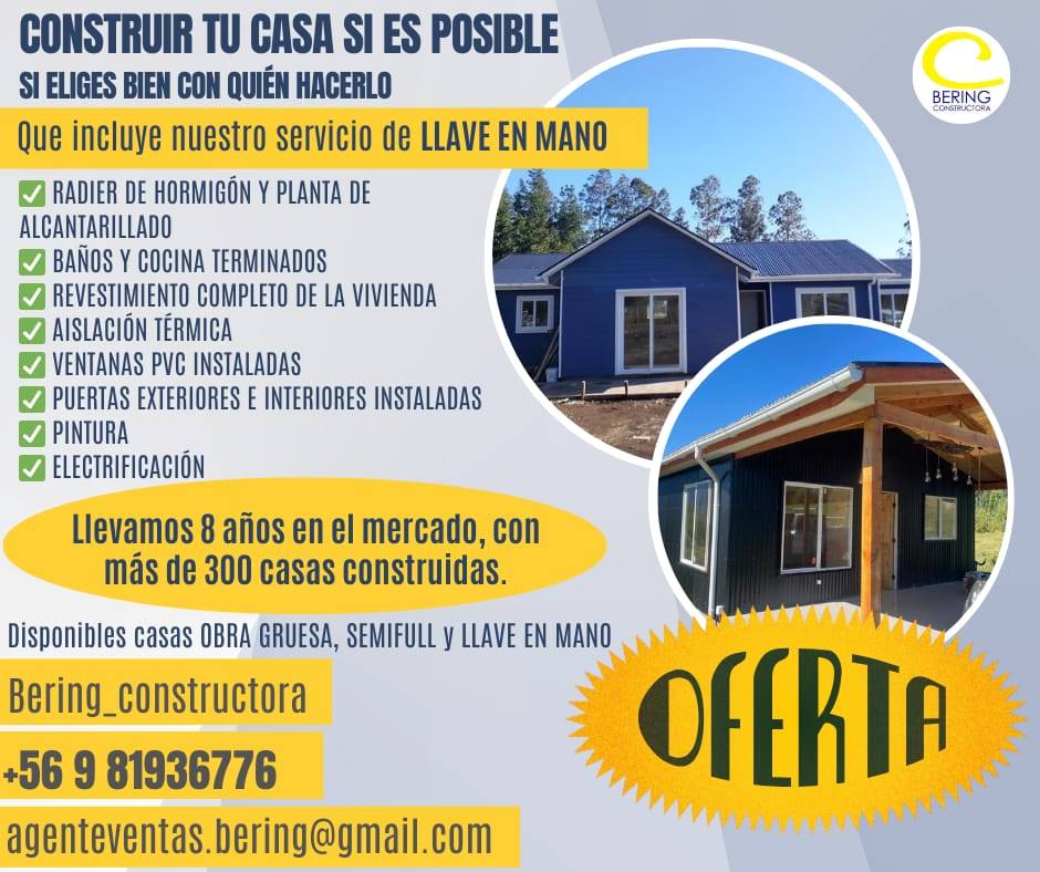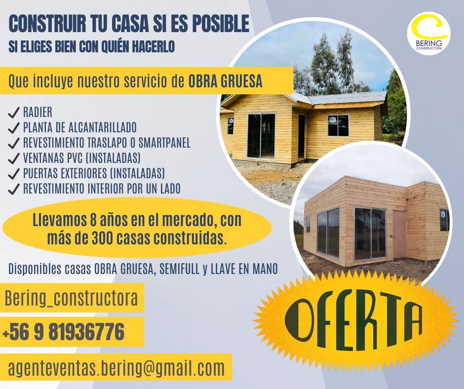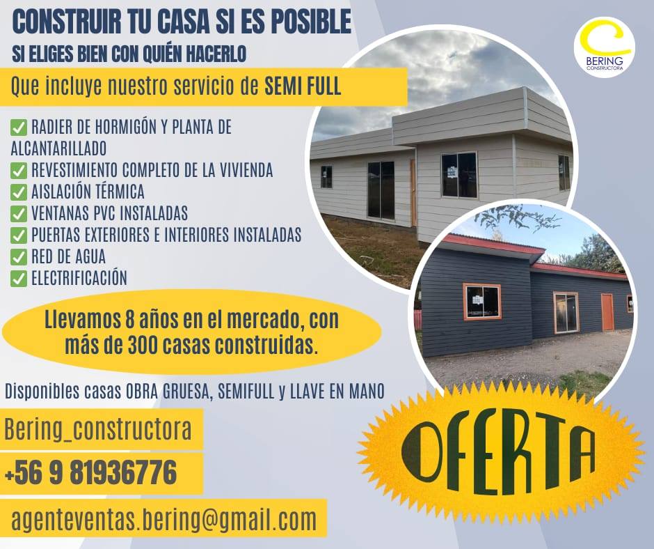 Servicio de construcción de casas en modalidades obra gruesa, semifull y llave en mano. Incluye radier, alcantarillado, baños, cocina, revestimiento, aislación, ventanas PVC, puertas, pintura y electrificación. Empresa con 8 años de experiencia y más de 300 casas construidas.