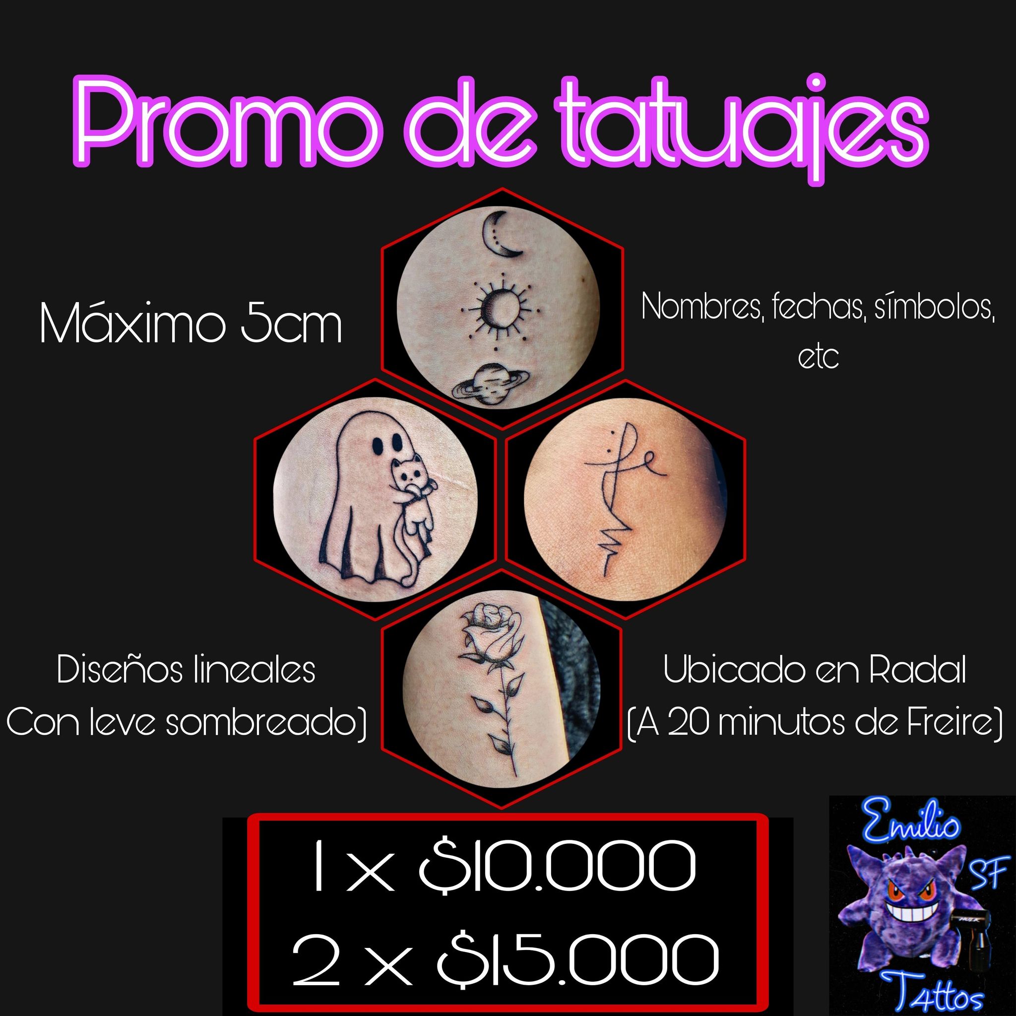 Tatuajes de nombres, fechas, símbolos y diseños lineales con leve sombreado. Precio de 1 tatuaje por $10.000 o 2 tatuajes por $15.000. Ubicado en Radal, a 20 minutos de Freire.